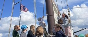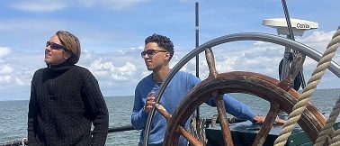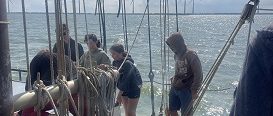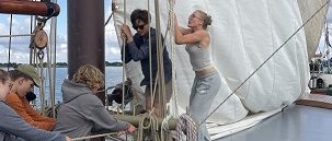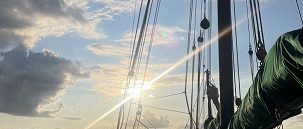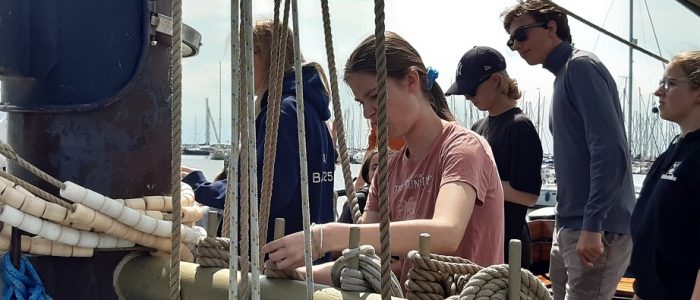 Am nächsten Morgen gab es eine Einführung in das Segeln und die generellen Regeln an Bord durch unseren Matrosen Finneas. Auch wenn uns viele Begriffe zunächst nichts sagten, stellten wir uns der Herausforderung und so hissten wir zum ersten Mal die Segel. Das Großsegel zu hissen war echte Teamarbeit und wirklich anstrengend, aber auch das meisterten wir. Am Ende stellten wir sogar den Rekord für das schnellste Hissen des Großsegels einer Gruppe im Jahr 2025 auf.