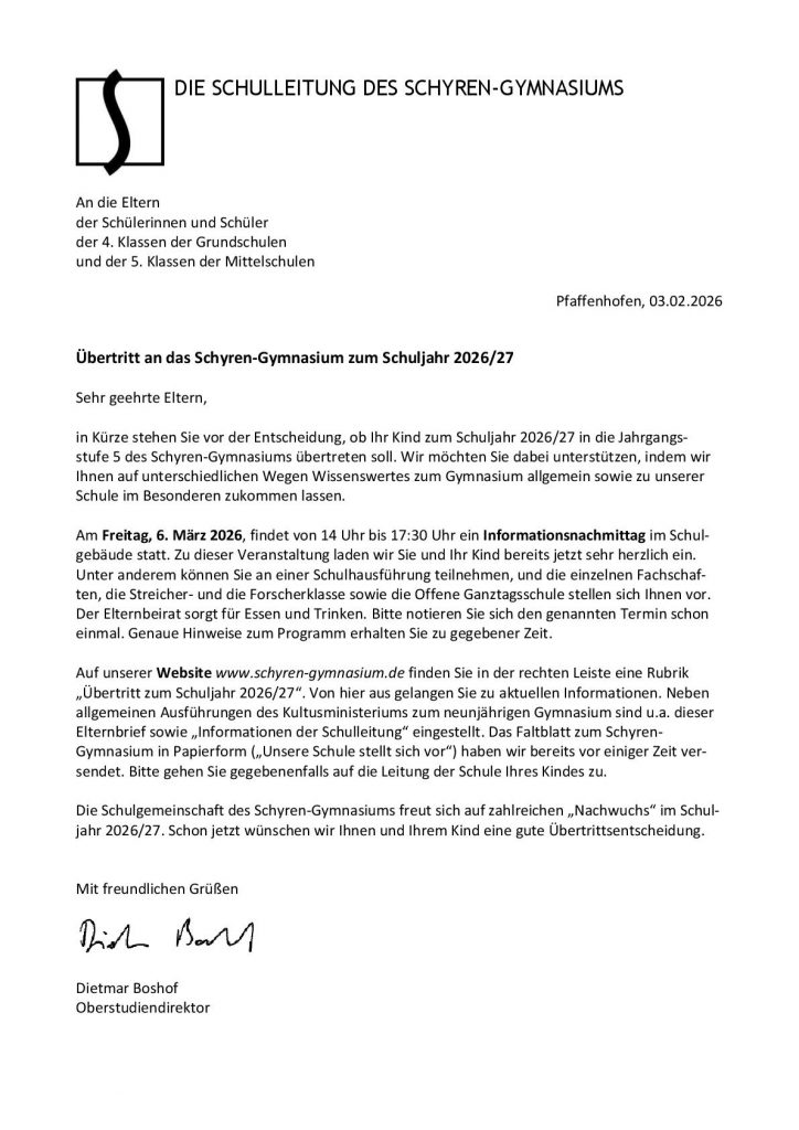 Weitere Informationen zum Schulleben am Schyren-Gymnasium erhalten Sie hier auf unserer Website oder im direkten Gespräch mit der Schulleitung und den Lehrkräften des Schyren-Gymnasiums. Wir wünschen Ihnen eine gute Entscheidung und freuen uns auf Ihr Kind!