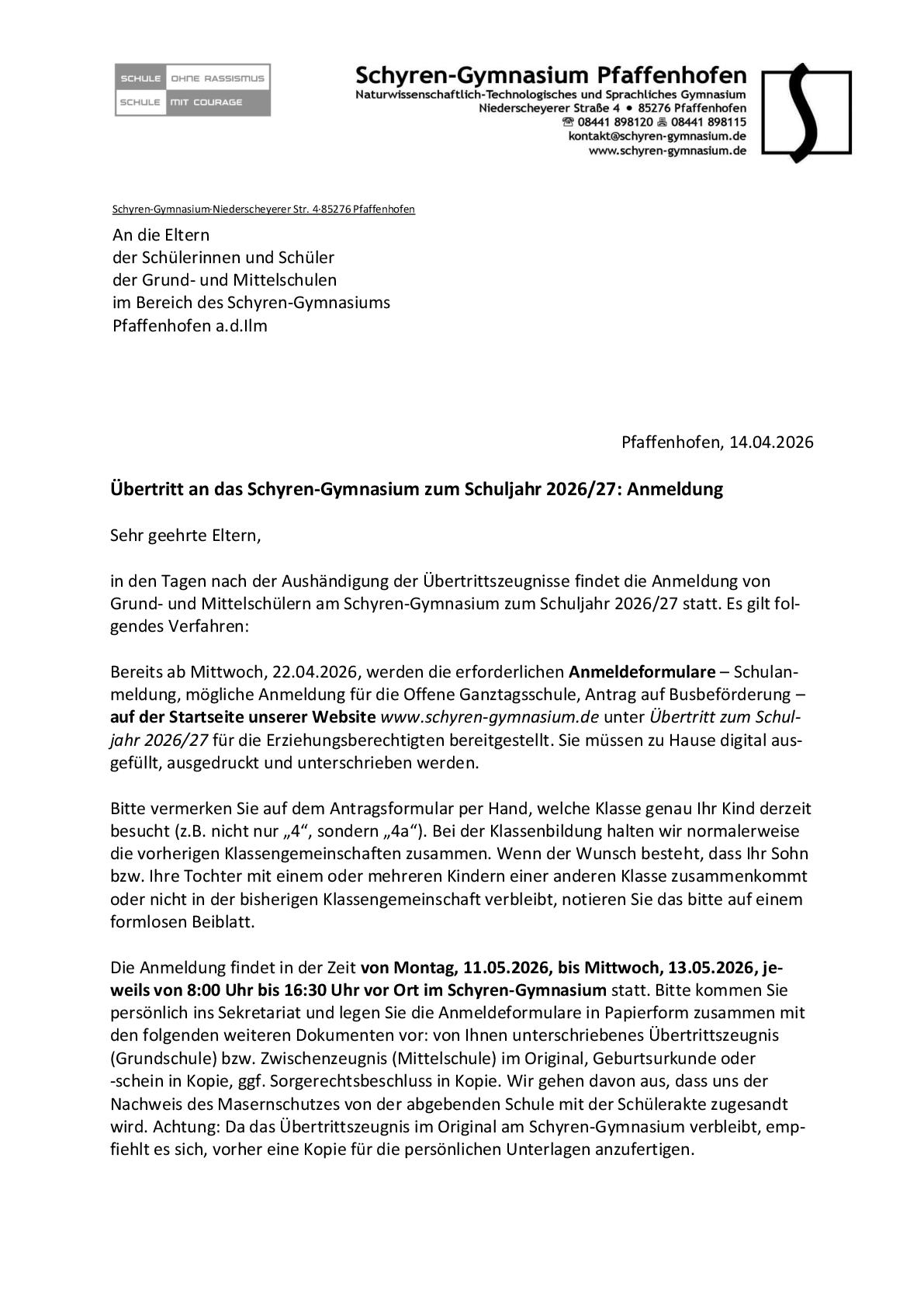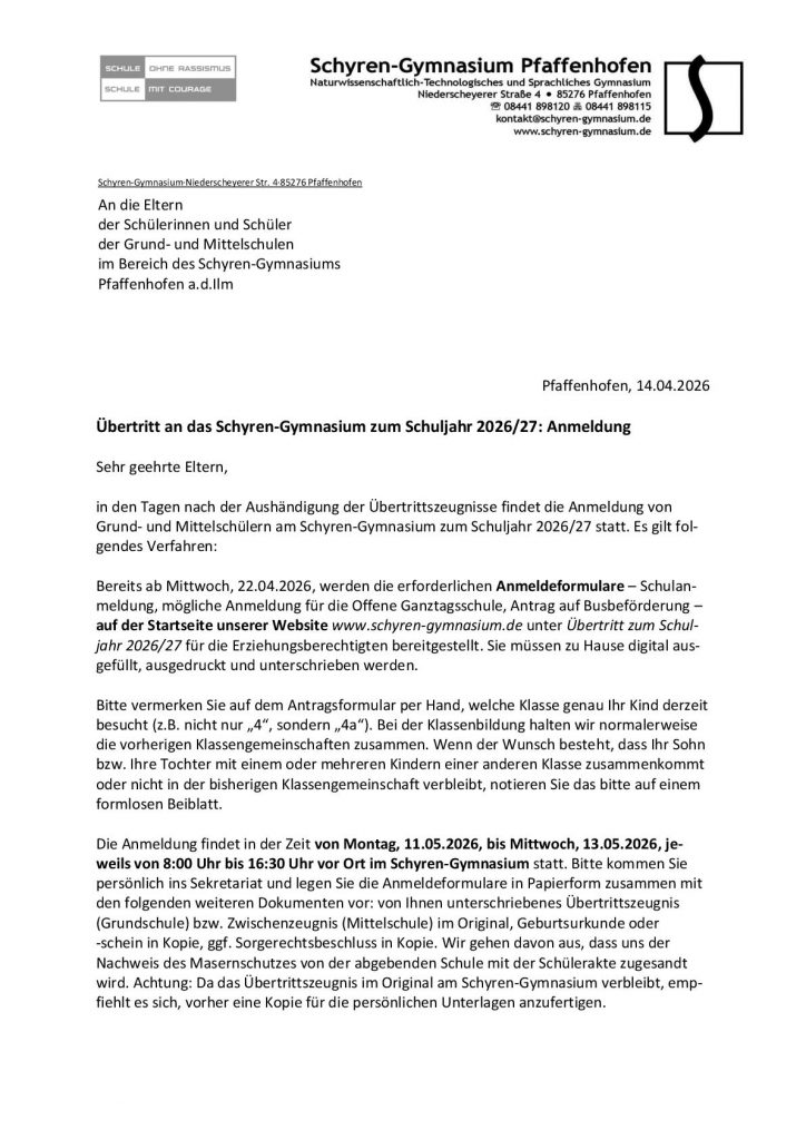 Das Anmeldeformular soll auf der Website des Schyren-Gymnasiums ab Dienstag 22. April 2025 vorab online ausgefüllt und ausgedruckt werden. Die Unterlagen sind auf jeden Fall im genannten Zeitraum persönlich im Sekretariat abzugeben.