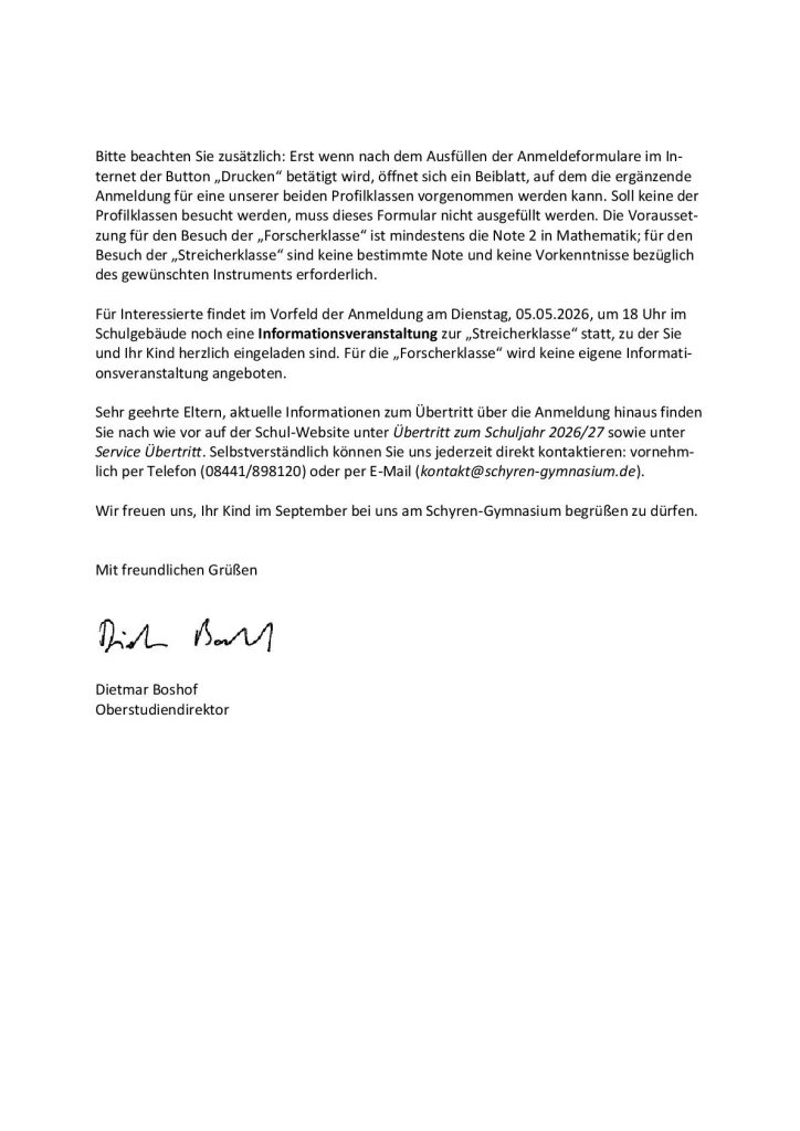 Nähere Informationen zum Anmeldeverfahren folgen in einem gesonderten Schreiben an die Grund- und Mittelschulen.